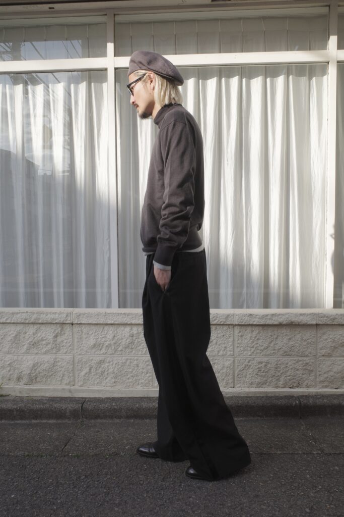 着古してくたびれたウールのように、表面が少しザラザラした質感になるようにシェービング加工。単なる真っ黒なスラックスって色気が強くなりすぎるので、個人的には少しくたびれているぐらいの方が好き。古着だと自身の経験上、着用感が重めなものが多い中でこのトラウザーはそこを解消してくれる。トラッドなものの破壊というか、キミノリさんのプロダクトにはやっぱりあの当時憧れたモードな文脈が秘められている。