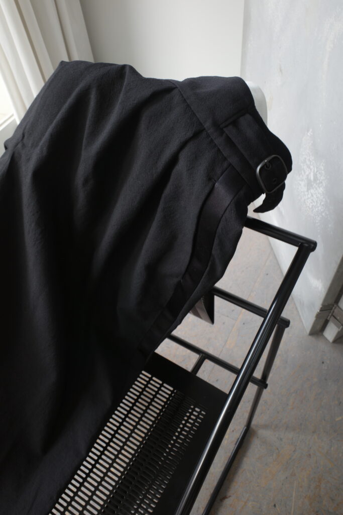 そんなこんなで、個人的思い出を彷彿とさせるKIMINORI MORISHITAの側章パンツ。こちらも買い付けました。サイドアジャストで絞って履くクラシックデザインのグルカトラウザーで、シルエットは見ての通りワイドです。着用感の軽いトロピカルウール生地を使用して、こちらももちろん加工が施されています。